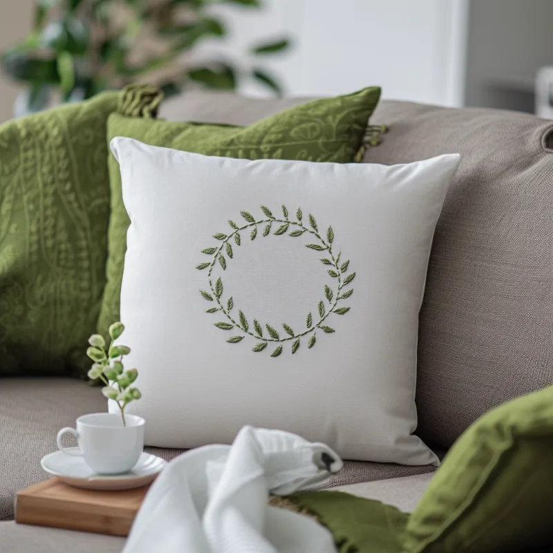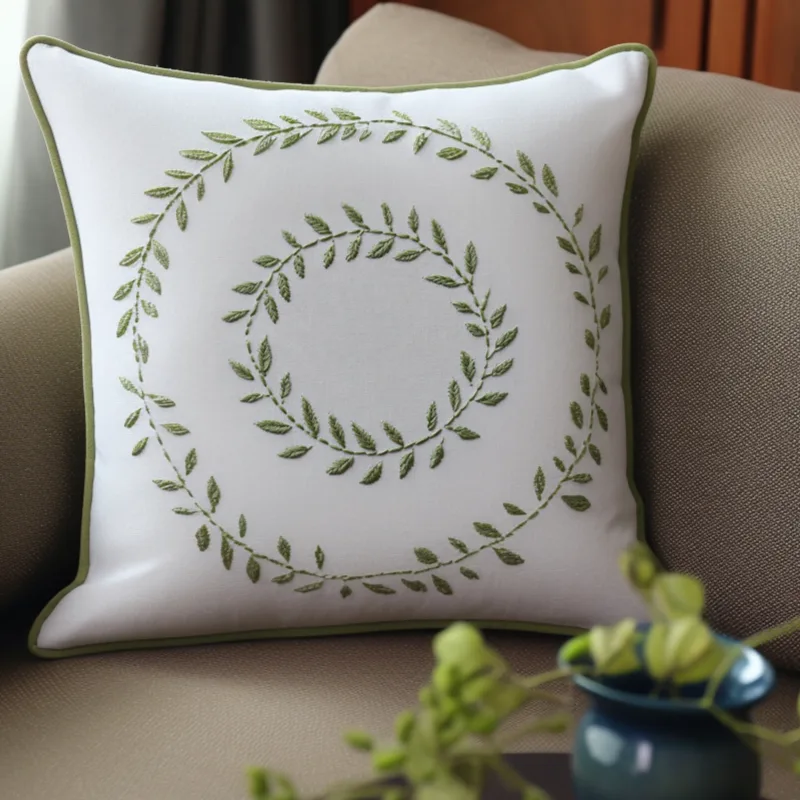 We chose soft linen fabric as the perfect canvas for you to trace the graceful arc of each leaf. The pattern’s heart is the open space in the center, waiting for your personal touch.