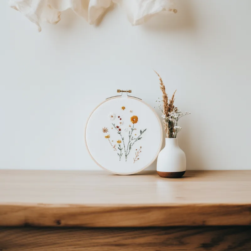 Imagine a field of wildflowers, scattered like tiny stars across a quiet sky. This isn’t a tight bouquet, it’s a whisper of nature, captured in thread.