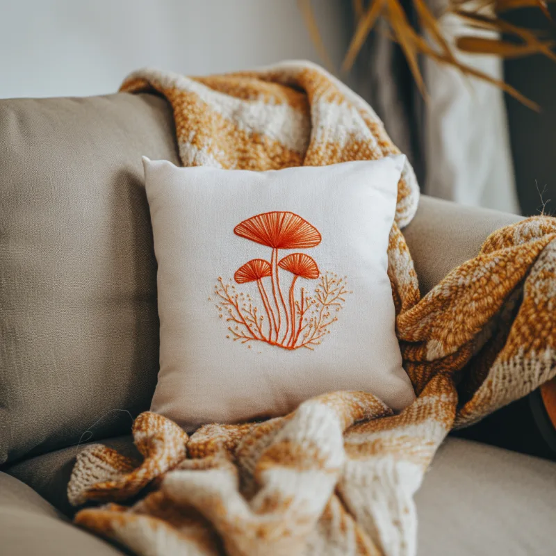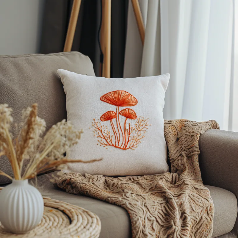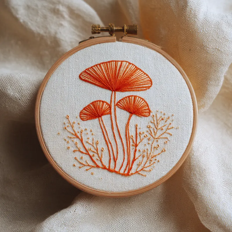 Sometimes, stripping away a full color palette lets the actual art shine through. This modern mushroom embroidery design uses only a single, warm shade of orange thread, and the result is absolutely striking.